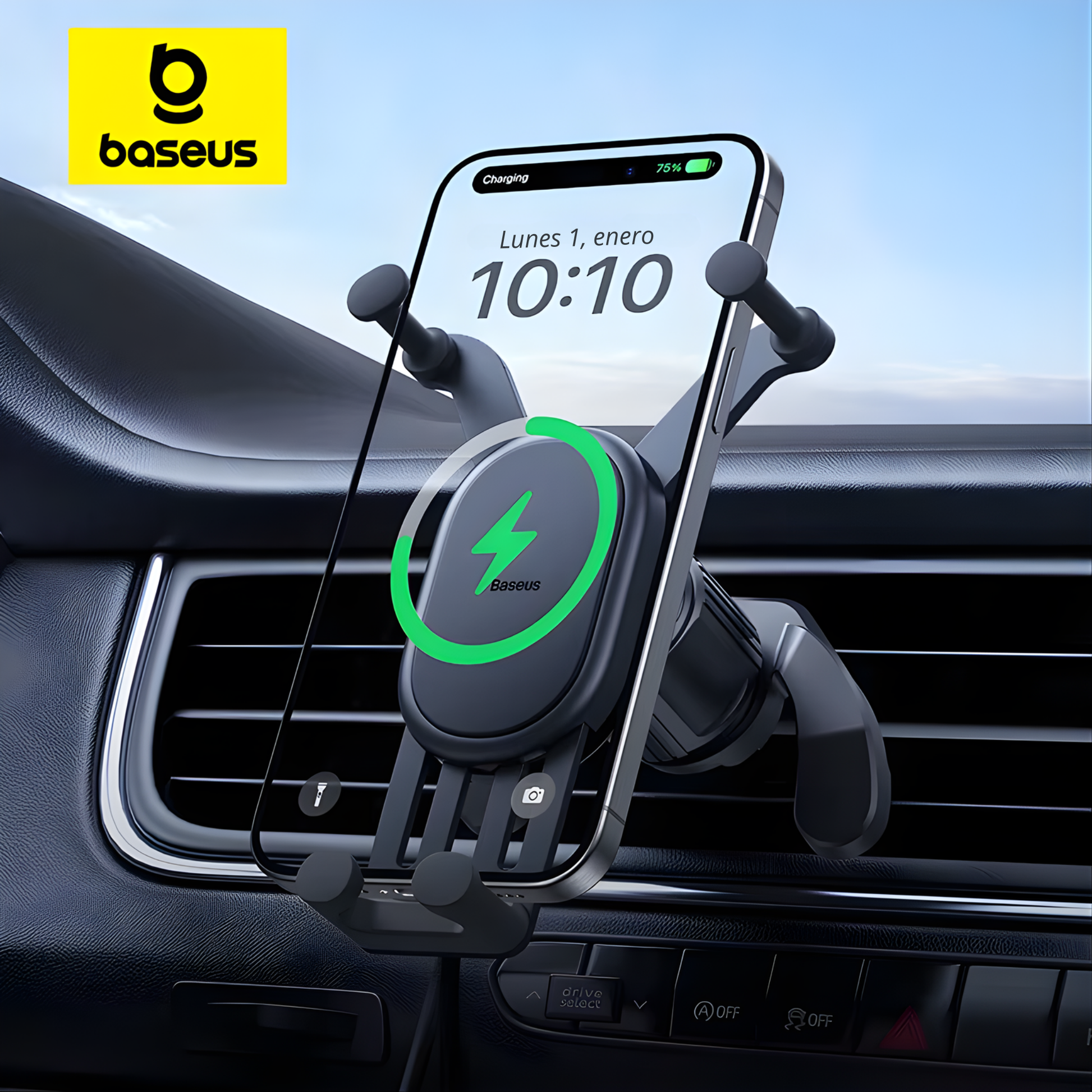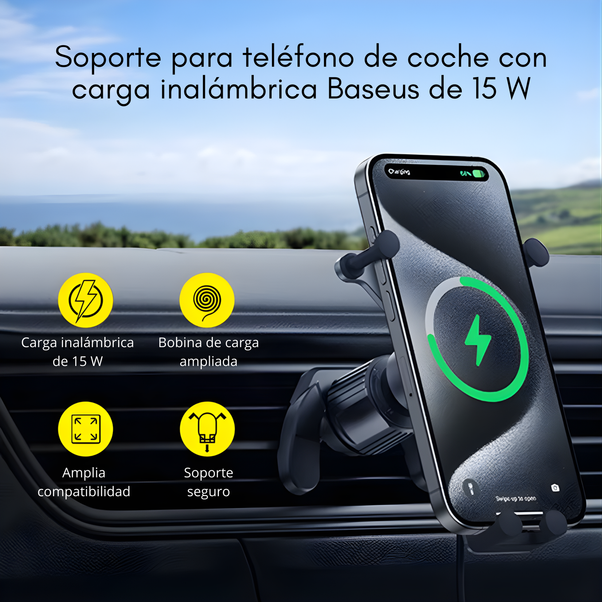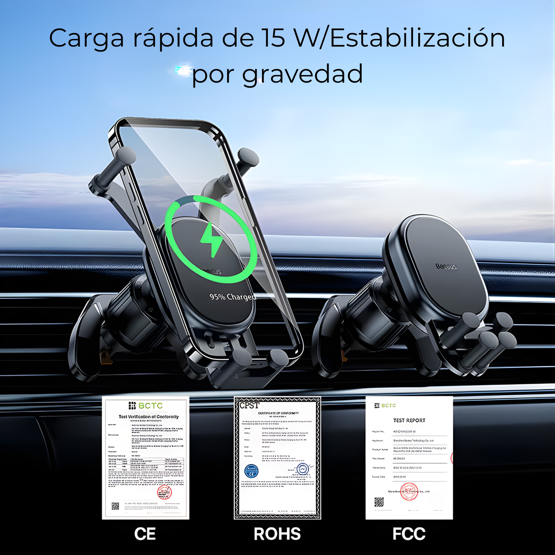 Soporte para teléfono de coche con carga inalámbrica rápida de hasta 15 W, ideal para usar el móvil de forma segura mientras conduces. Incorpora un sistema de sujeción por gravedad que mantiene el teléfono firme y estable, evitando caídas o deslizamientos incluso en carreteras irregulares.
